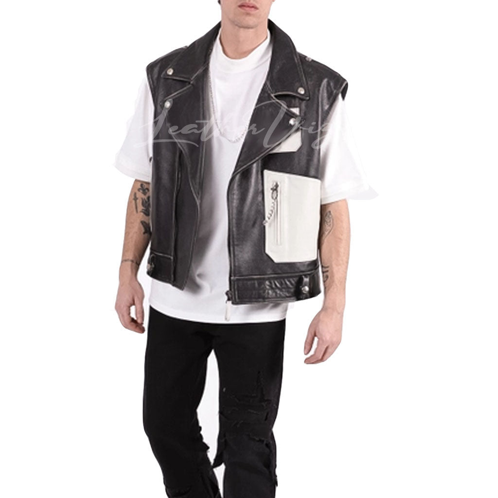 BLACK AND WHITE SLEEVELESS LEATHER VEST FOR MEN