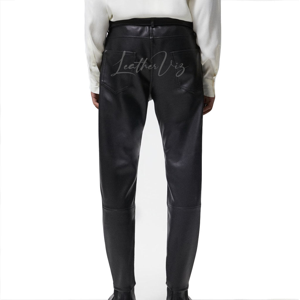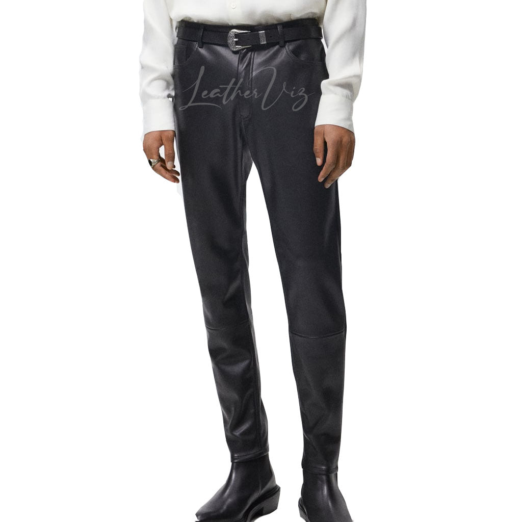 Get thus unique collection corporate style men leather pants which is crafted from lamb skin leather and featured with five-pocket trousers and has zip fly and top button fastening closure and has loops at waist. It is narrow at hem and has paneled detailing. Also it is fully lined and available in several colors and all sizes. So men hurry up!! Get this cool style leather pants now.
