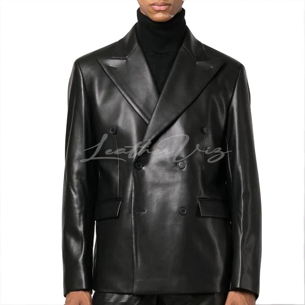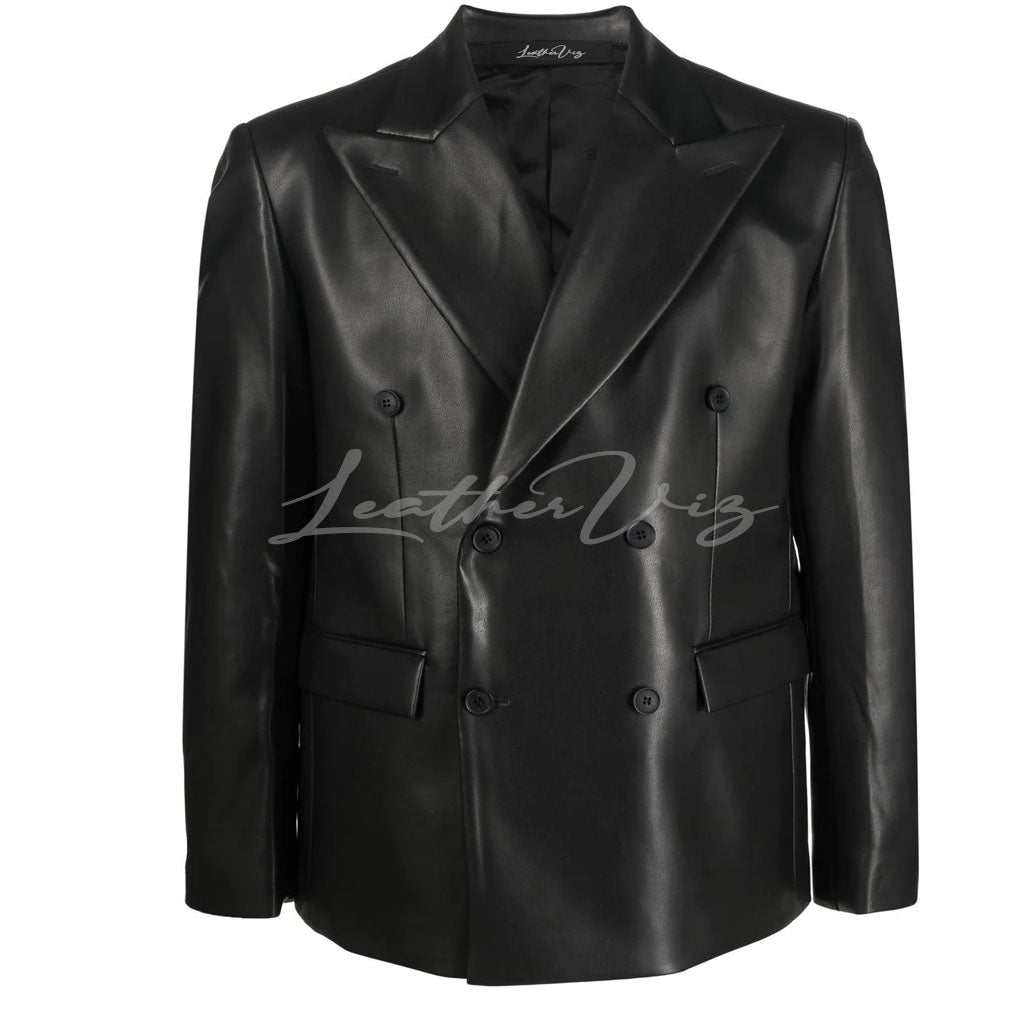 DOUBLE-BREASTED BLACK LEATHER CORPORATE BLAZER