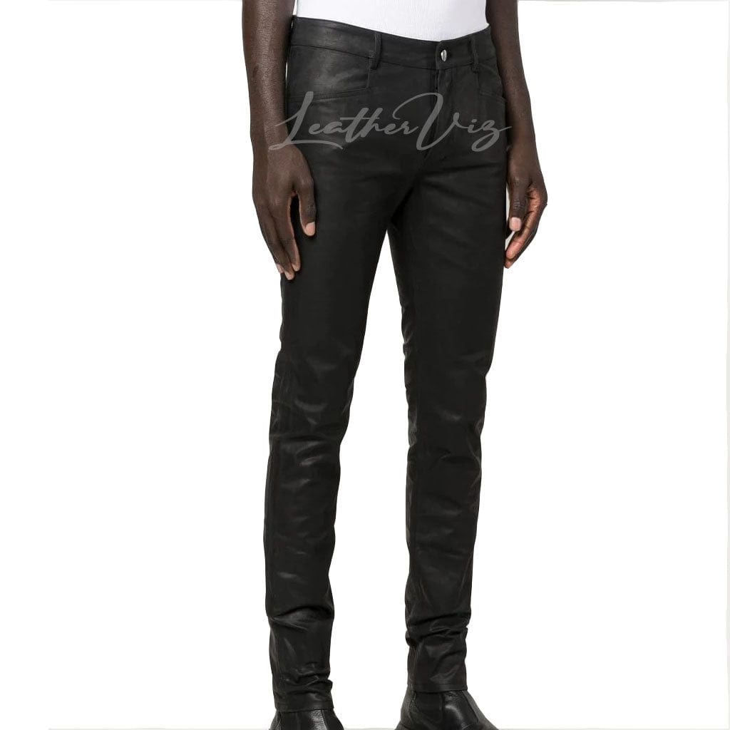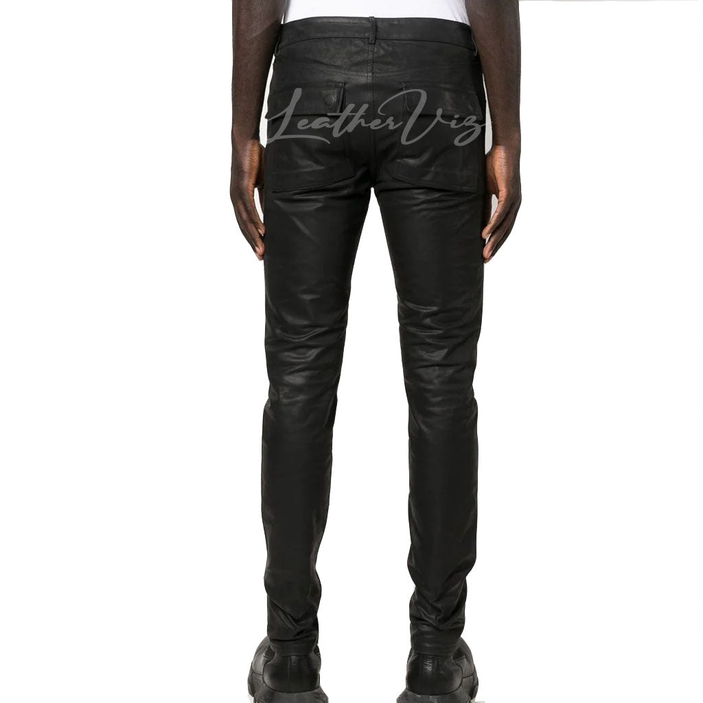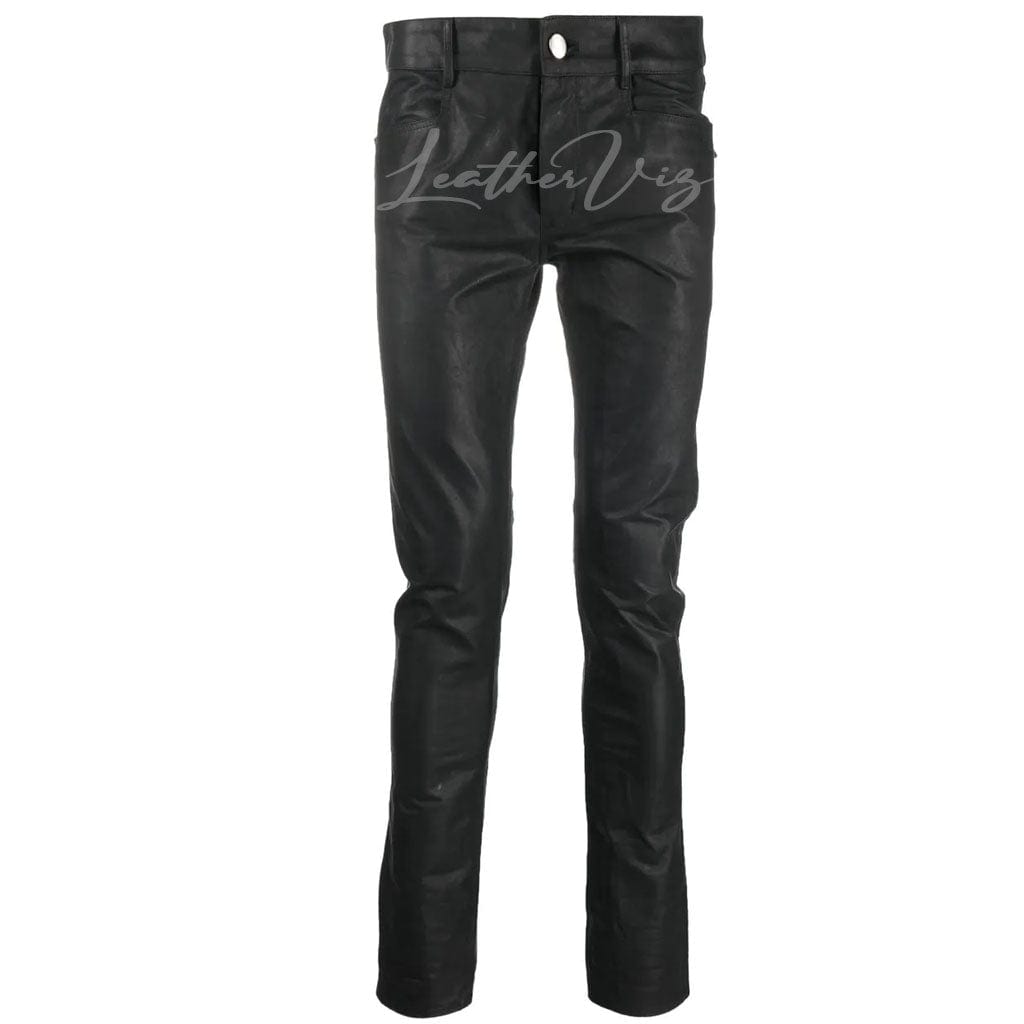 Hold this classic style men black skinny leather trousers which is made from lamb skin leather and featured with a mid-rise waist and belt loops. This skinny leather trousers has a front button and zip fastening and has two side inset pockets. It has two rear flap pockets and a skinny cut. Also, it has paneled detailing and is fully lined. So men hurry up!! Get this cool style leather trousers straight leg now.