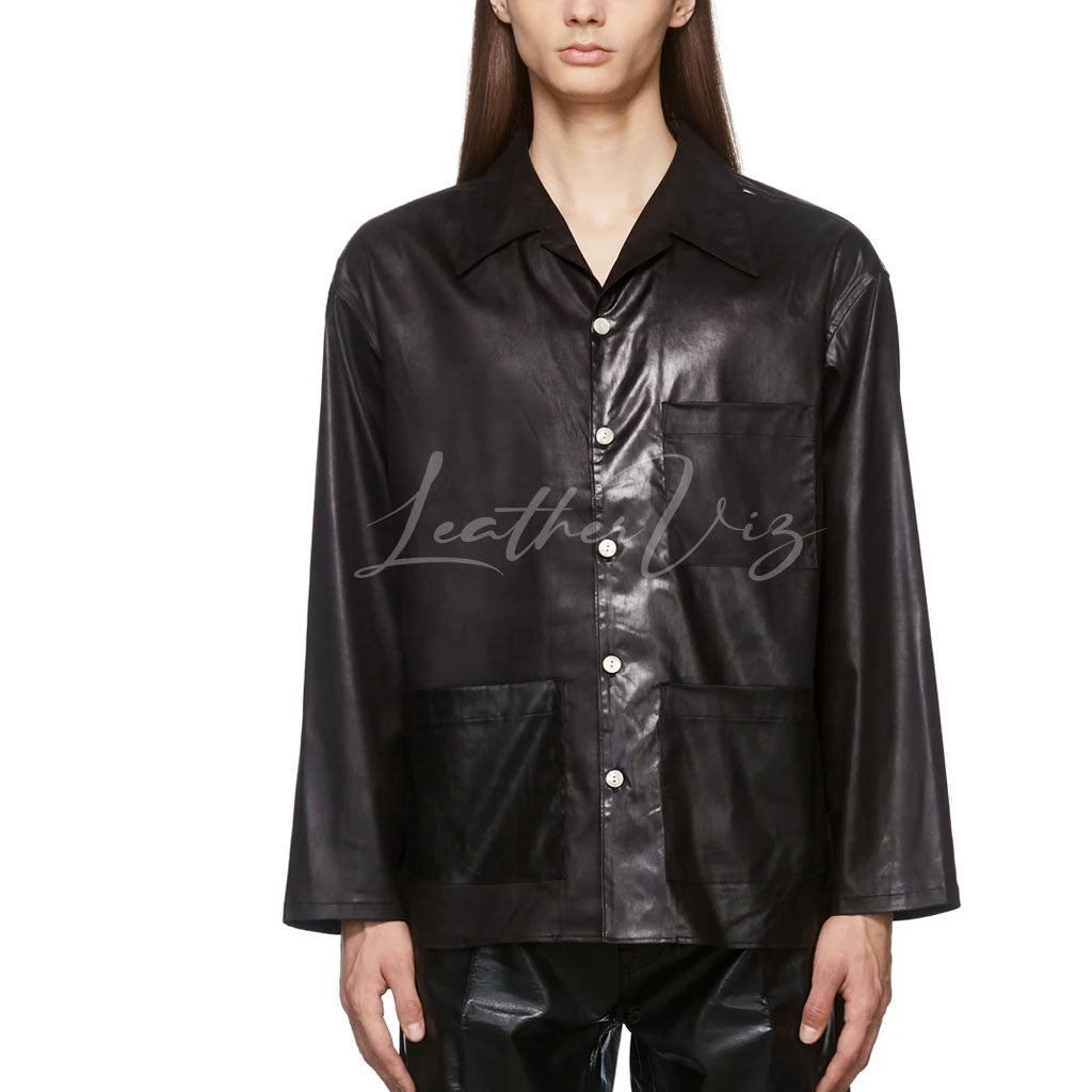 OPEN COLLAR MEN FAUX LEATHER SHIRT