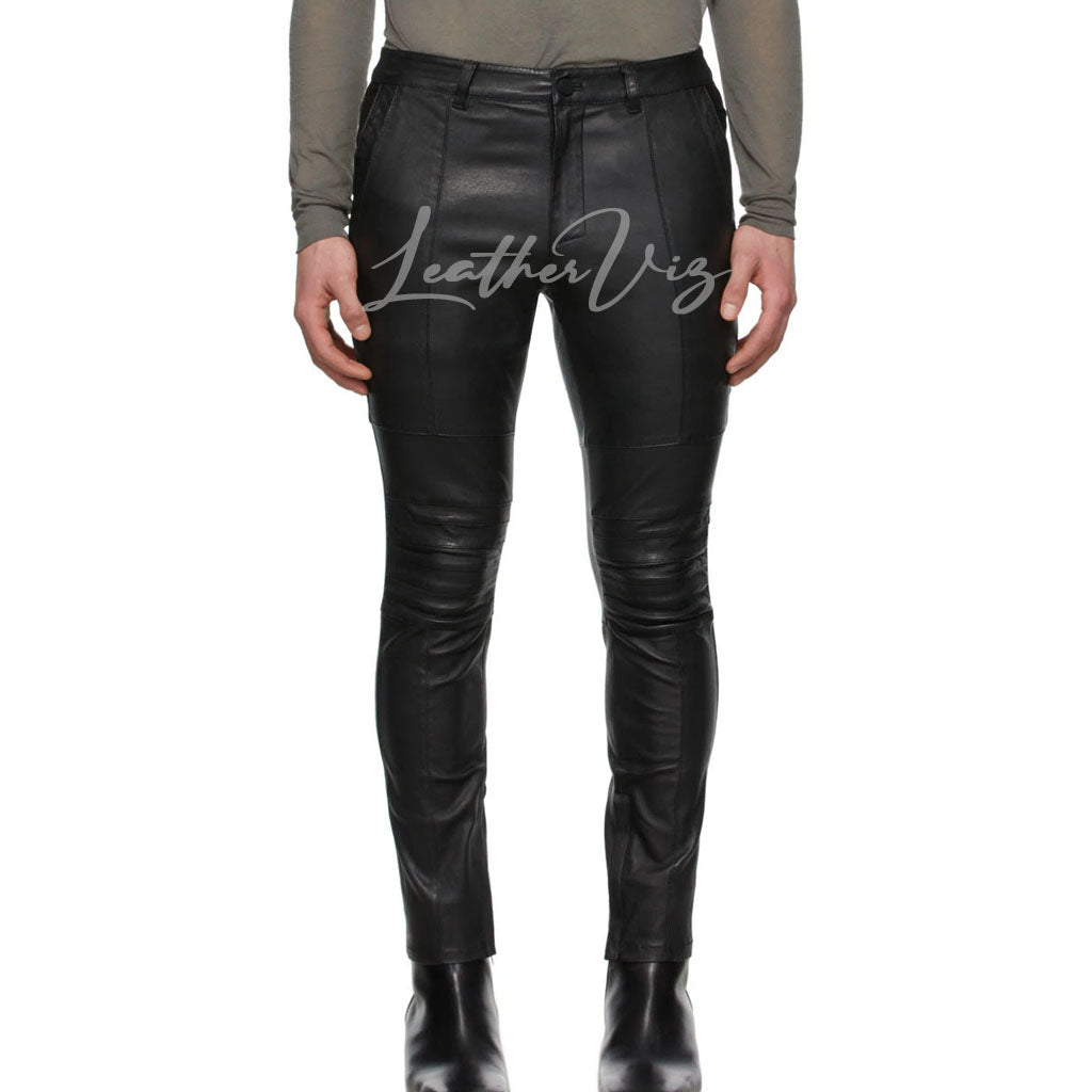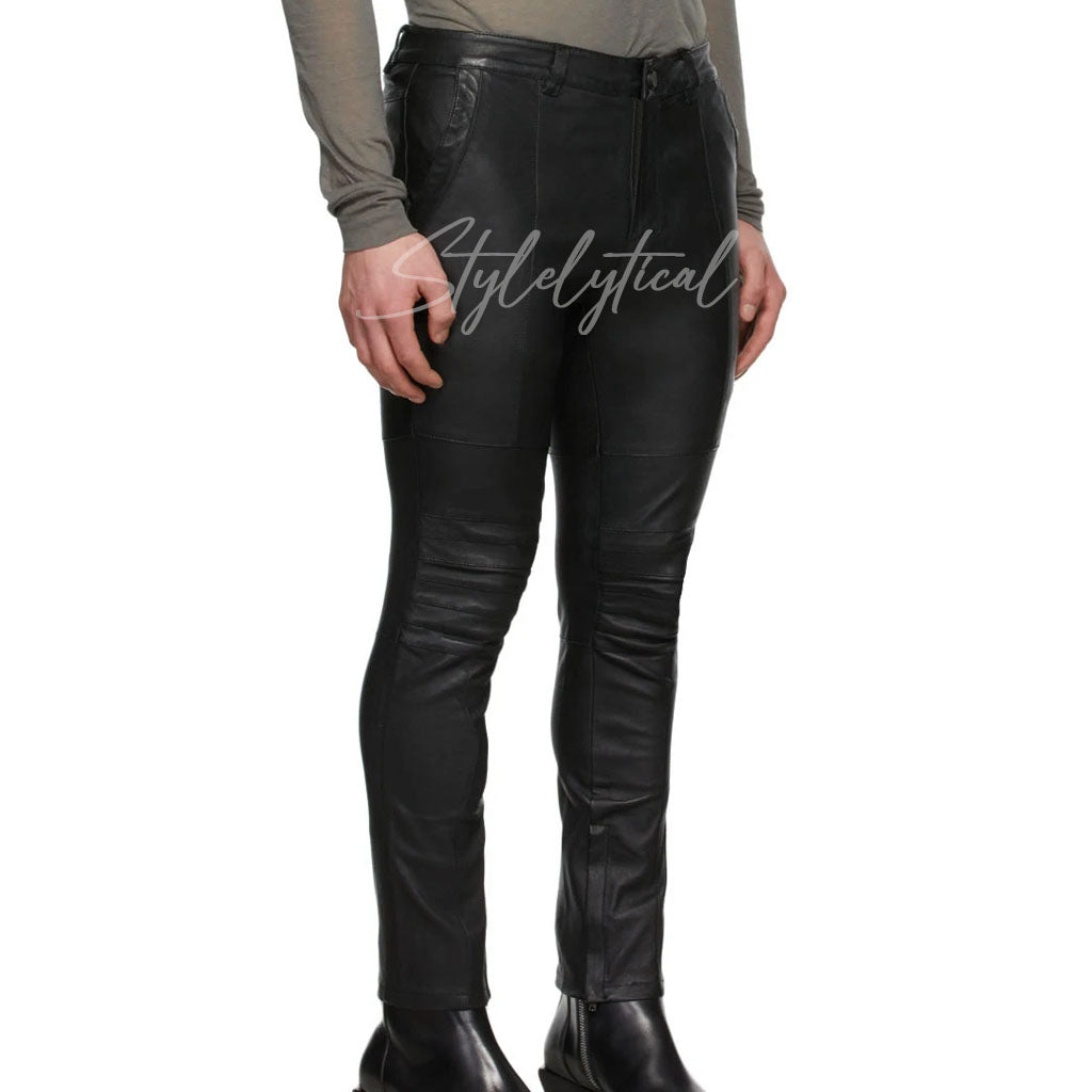 Hold this cool style paneled style men leather trouser which is crafted from lamb skin leather and featured with paneled style and has belt loops at the waistband. It is a four-pocket styling men black leather pant and has zip vent at cuffs and fully lined. Also it is available in several colors and also men get this cool paneled leather trouser now. Hurry up!! This will be the best choice as men corporate leather pants, So men get it now.