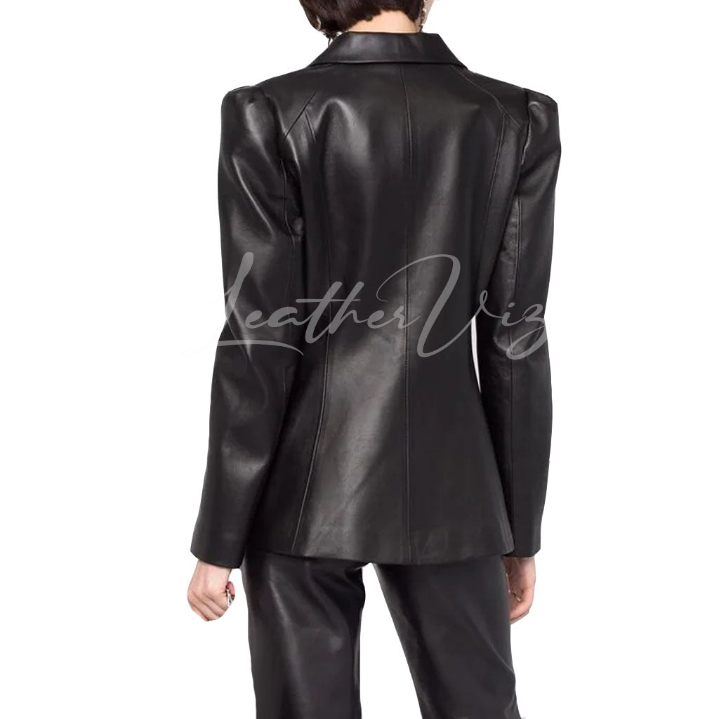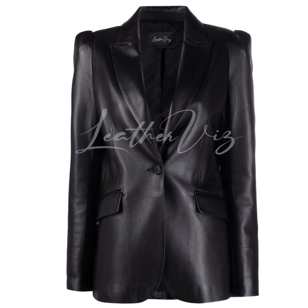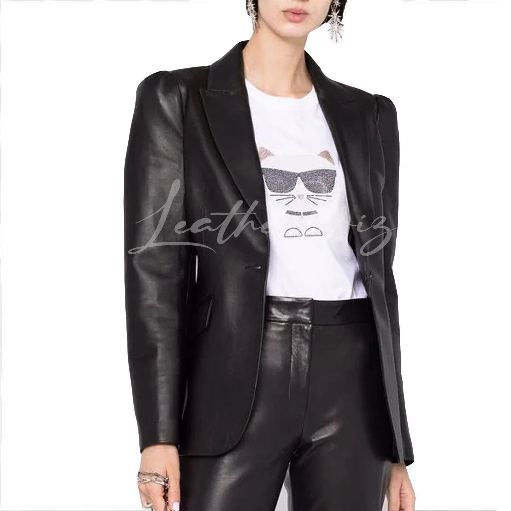 PUFF SLEEVES CORPORATE SINGLE-BREASTED LEATHER BLAZER