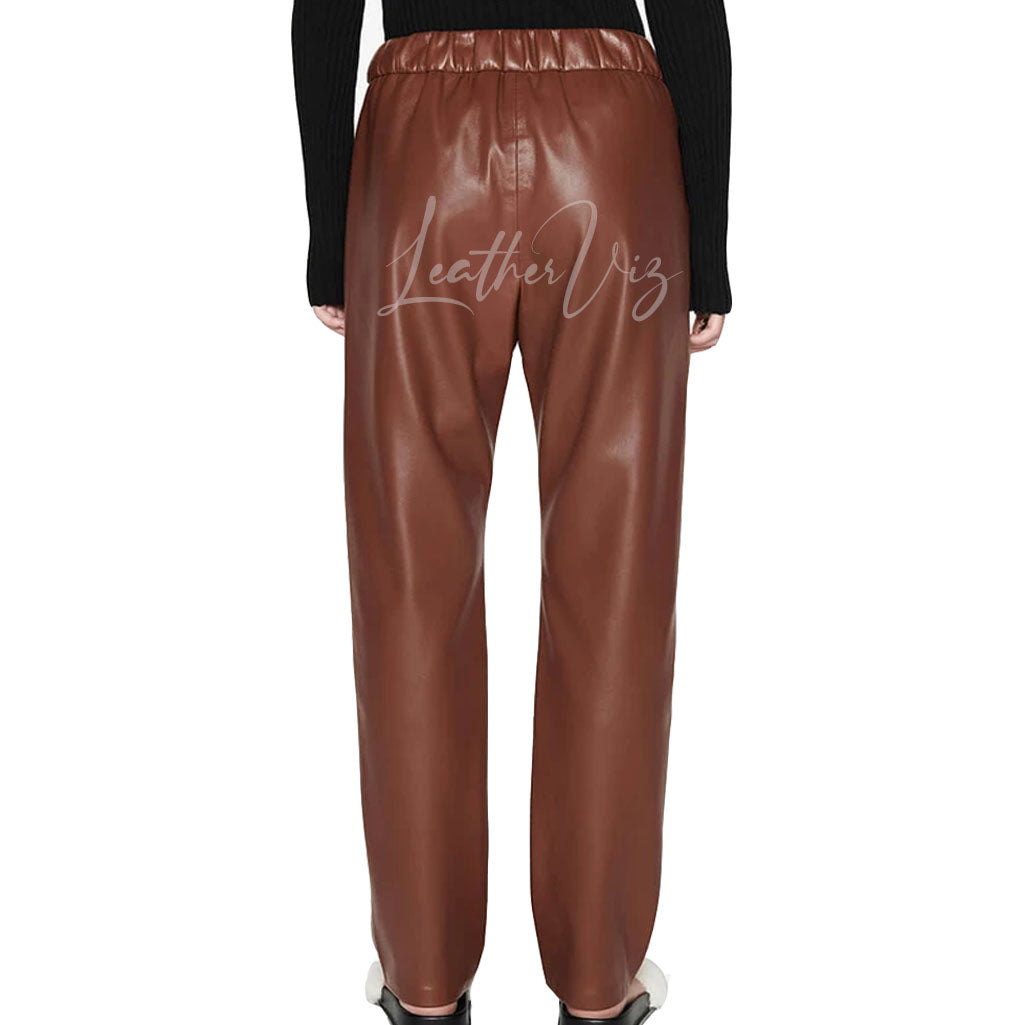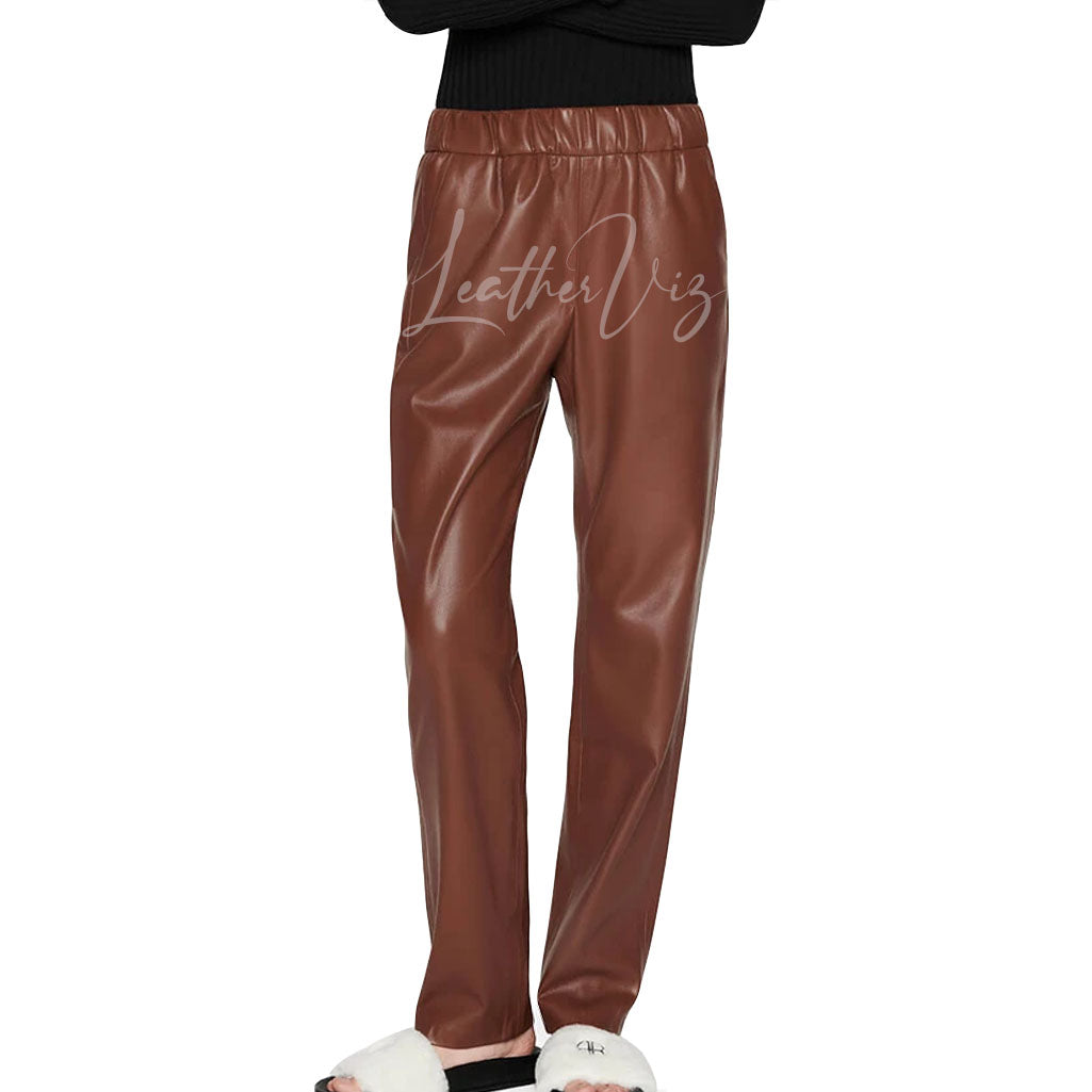 Get this cool style pull on style women leather pants which is made from lamb skin leather and featured with pull-on style. It has elastic waist and has side pockets. It is a simple style leather pants for women which has ankle length. Also, it is fully lined and available in several colors and all sizes. So, women hurry up!!
