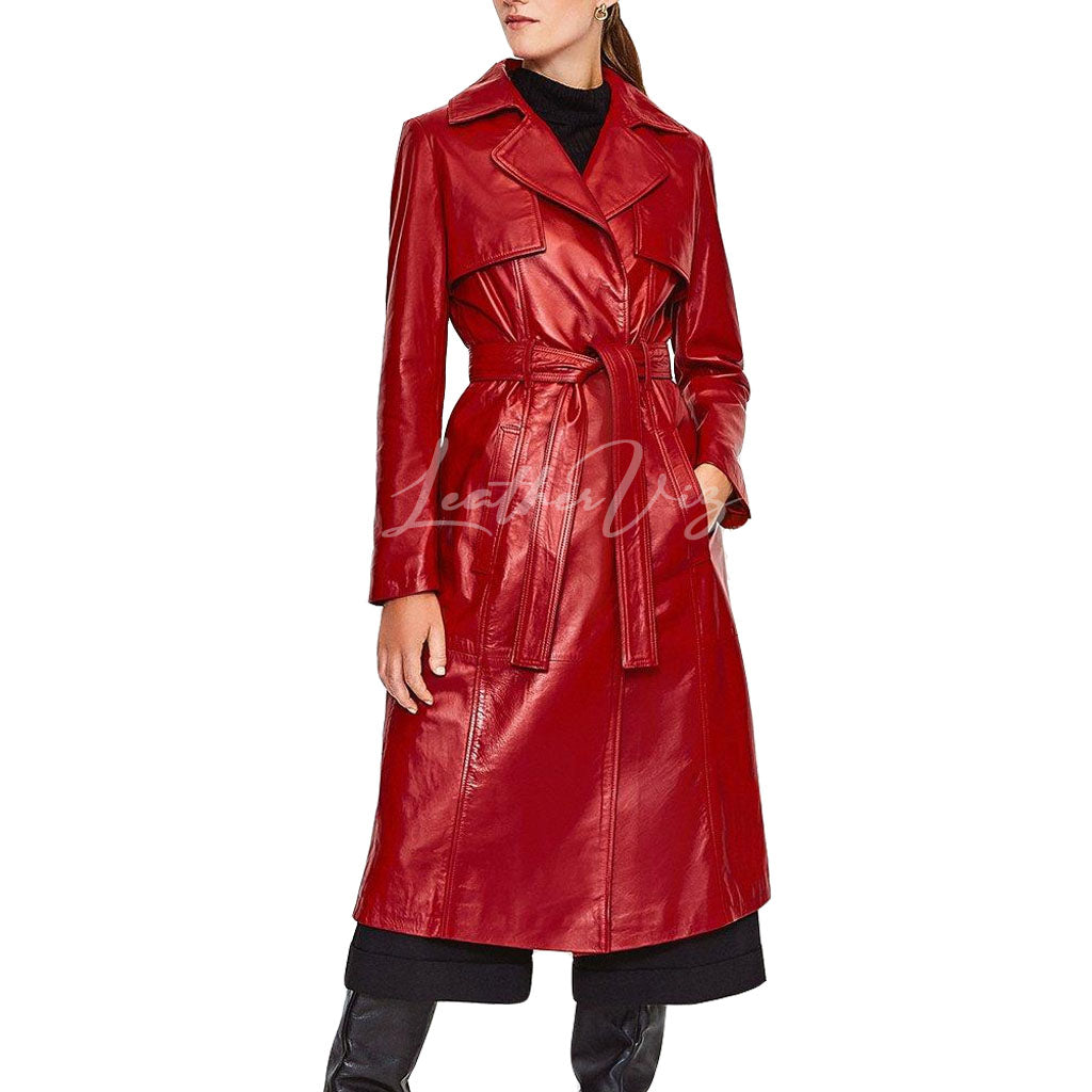 RED LEATHER TRENCH COAT FOR WOMEN