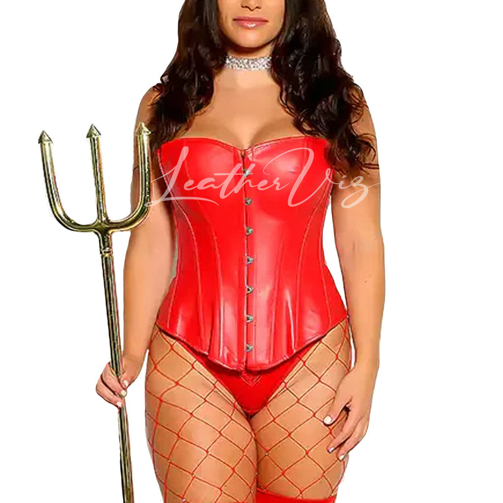 Get this hot style red strapless faux leather corset Halloween devil costume which is crafted from faux leather and featured with sweetheart neckline. This is a strapless leather corset which has boned detailing and has busk detail. It has back lace up detailing and fully lined. Also this red leather corset is available in several colors and all sizes. So women get this halloween special leather corset now.