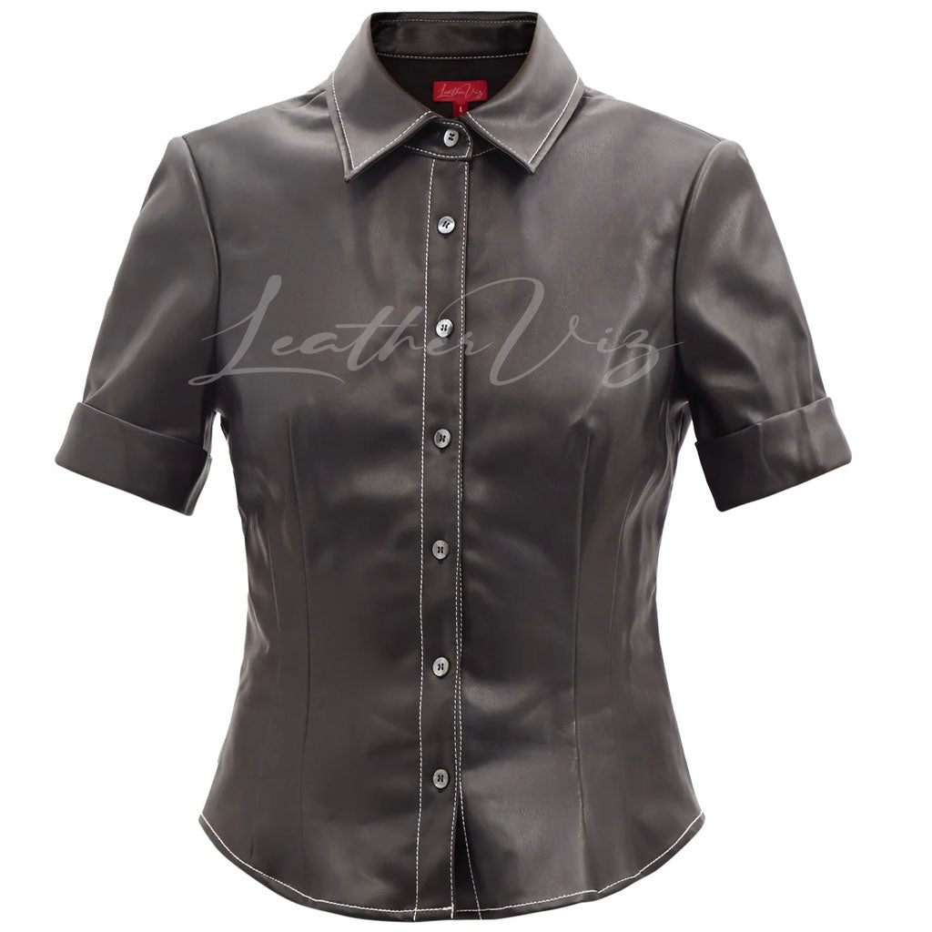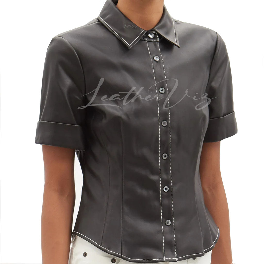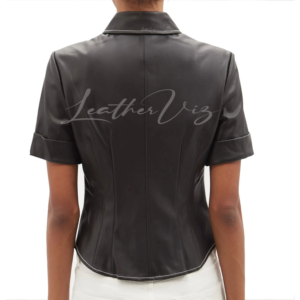 SHORT SLEEVES WOMEN BLACK LEATHER SHIRT