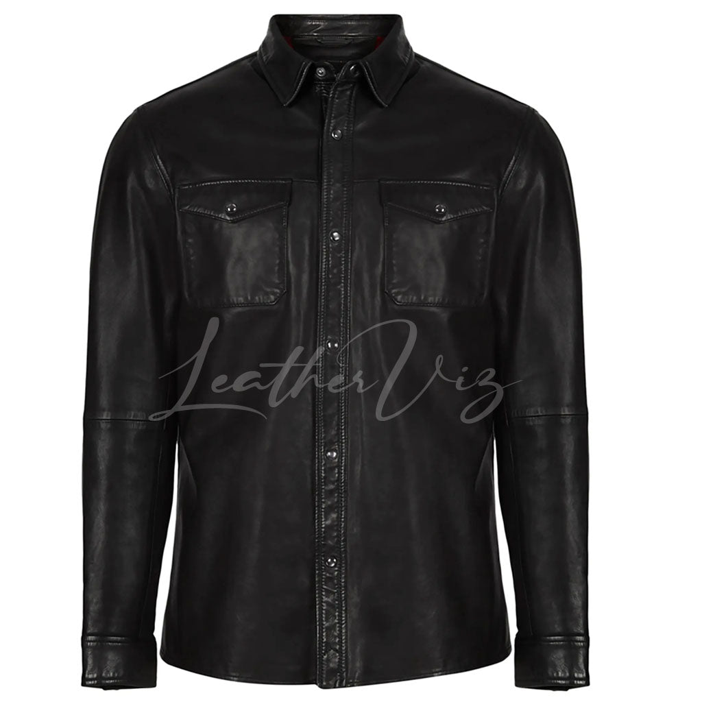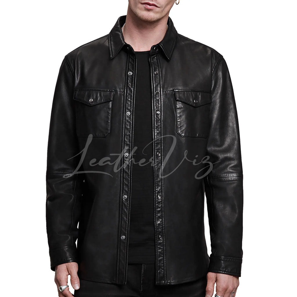 Hold this cool style spread collar men leather shirt which is crafted from lamb skin leather and featured with Front snap closure and has spread collar. It has Long sleeves with snap cuffs and has Chest snap-flap patch pockets. It is fully lined and available on several colors and all sizes. So men get this amazing style leather shirt now. Hurry up!!