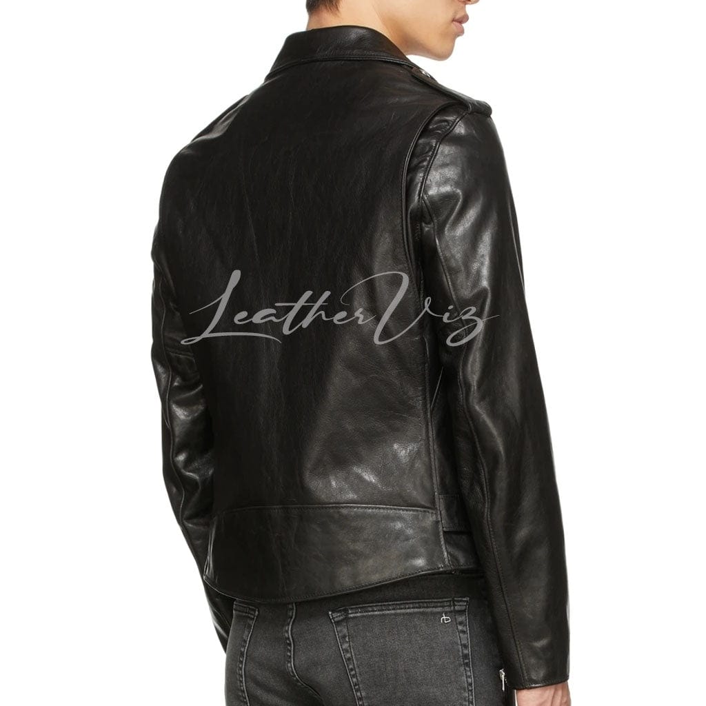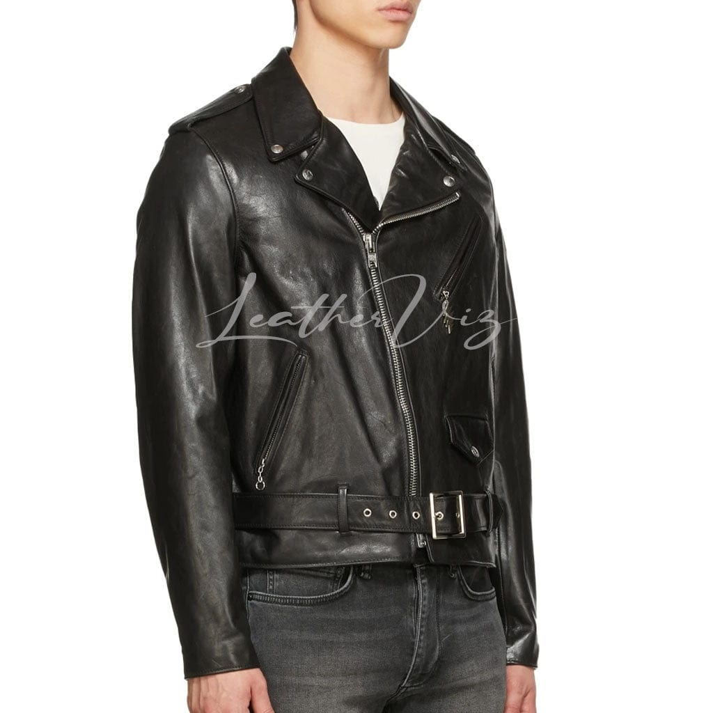 WAIST BELTED MEN MOTORCYCLE LEATHER JACKET