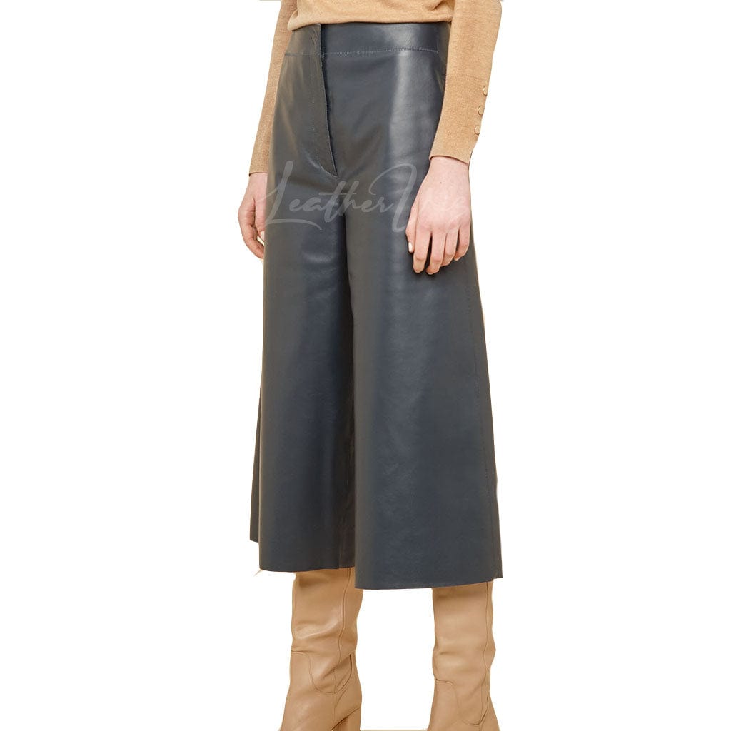 Get this classic style women leather culottes pant which is made from lamb skin leather and featured with front zipper closure with button. It has paneled detailing and has a wide leg. This is a cropped detailing leather pant for women. It has fully lined and available in several colors and all sizes. So women hurry up!!